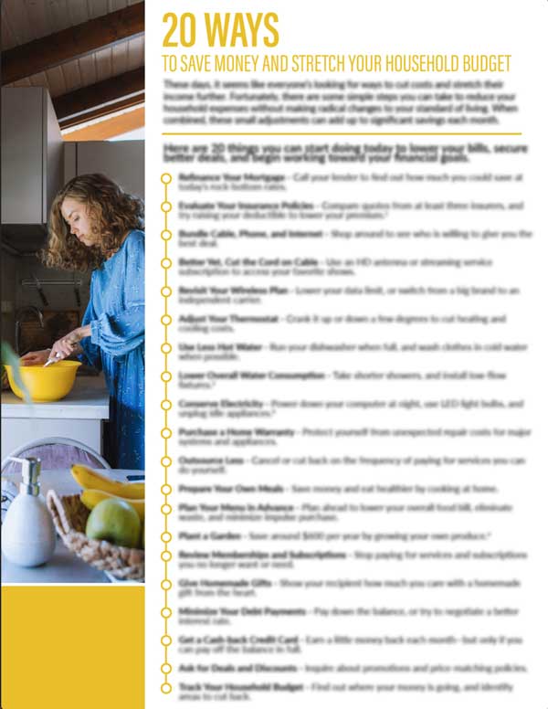 Discover 20 ways to save money and stretch your household budget. And, use the budget worksheet to track your income and expenses.